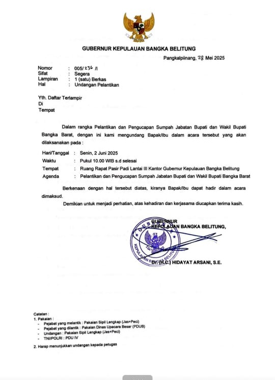 Gubernur Hidayat Arsani akan mewakili Menteri Dalam Negeri melantik pasangan pemenang Pilkada Serentak Bangka Barat 2024 ini.